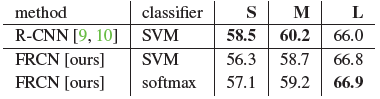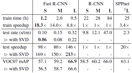 모든 Fast R-CNN 결과는 VGG16 미세 조정 레이어 conv3_1 이상을 사용하는 이 논문의 결과입니다; 모델 S 및 M을 사용한 모든 실험은 conv2 이상의 레이어를 미세 조정합니다.