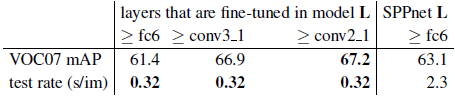 VGG16에서 conv 레이어를 미세 조정하는 것이 중요하다는 것을 확인하기 위해 Fast R-CNN을 사용하여 미세 조정하지만 완전히 연결된 레이어만 학습하도록 13개의 conv 레이어를 고정합니다.