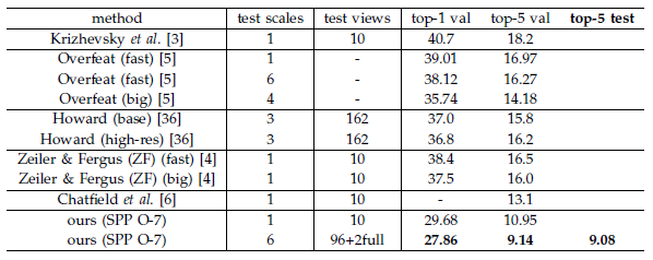 ImageNet 2012 데이터 세트에 대한 일련의 통제된 실험에서 SPP는 SPP가 없는 대응물에 비해 기존 출판물 [3], [4], [5] (또는 수정 사항)에서 네 가지 CNN 아키텍처를 개선한다는 것을 보여줍니다.