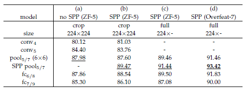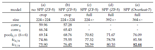 Pascal VOC 2007 및 Caltech101 결과에는 몇 가지 일반적인 관찰이 있습니다: SPP-net은 no-SPP net보다 낫고 (표 7 (b) 대 (a)) 전체보기 표현이 작물보다 낫습니다 ((c ) vs. (b)).