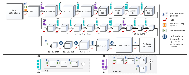 특히, 304x228 픽셀의 입력을 설정하고 ([6]에서와 같이) 입력 해상도의 약 절반이 될 출력 맵을 예측한다고 가정합니다.