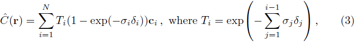 (ci, σi) 값 집합에서 ^C(r)을 계산하는 이 함수는 사소하게 미분할 수 있으며 알파 값 αi = 1- exp(-σiδi)를 사용하는 기존 알파 합성으로 축소됩니다.