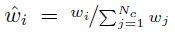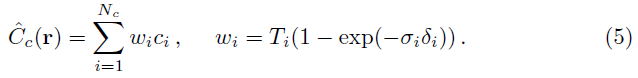 이를 위해 먼저 방정식 3의 거친 네트워크 ^Cc(r)에서 알파 합성된 색상을 광선을 따라 샘플링된 모든 색상 ci의 가중치 합으로 다시 작성합니다: