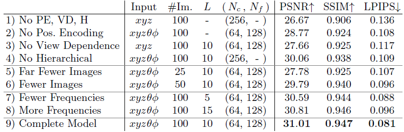 2-4행에서 전체 모델에서 이 세 가지 구성 요소를 한 번에 하나씩 제거하여 위치 인코딩 (2행) 및 뷰 의존성 (3행)이 가장 큰 양적 이익을 제공하고 계층적 샘플링 (4행)을 제공합니다.