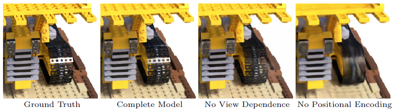그림 4에서 볼 수 있듯이 뷰 의존성 없이 훈련된 모델 (입력으로 x만)은 반사성을 나타내는 데 어려움이 있습니다.