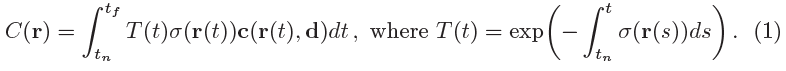 함수 T(t)는 tn에서 t까지 광선을 따라 누적된 투과율, 즉 광선이 다른 입자에 부딪히지 않고 tn에서 t로 이동할 확률을 나타냅니다.