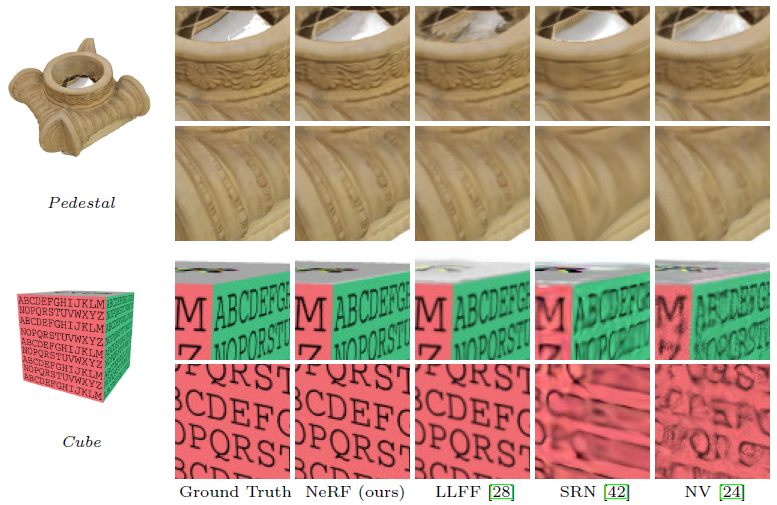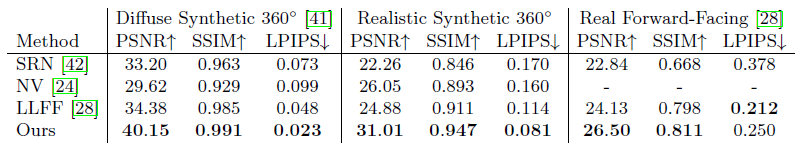 SRN은 동일한 저자에 의한 DeepVoxels [41]에 대한 더 나은 성능의 후속 조치이므로 DeepVoxels와의 비교를 포함하지 않습니다.