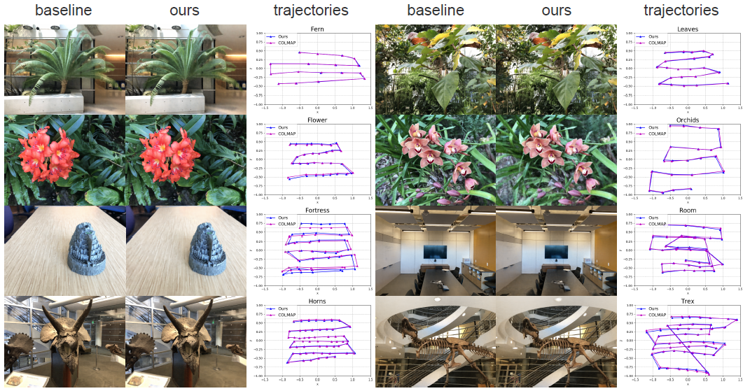 이렇게 하면 잠재적으로 잘못된 SfM 방법(예: COLMAP)을 사용하여 카메라 매개변수를 미리 계산할 필요가 없으며 여전히 COLMAP 기반 NeRF 기준과 유사한 뷰 합성 결과를 얻을 수 있습니다.