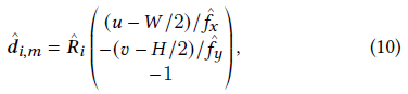 결과적으로 카메라 내장 추정은 초점 거리 𝑓_𝑥 및 𝑓_𝑦의 두 값을 추정하는 것으로 축소되며, 이는 학습 중에 학습 가능한 매개변수로 직접 최적화될 수 있습니다.