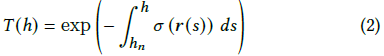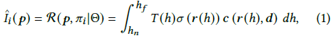 는 광선을 따라 누적된 투과율을 나타냅니다, 즉, 광선이 ℎ_𝑛에서 ℎ까지 다른 입자에 부딪히지 않고 이동할 확률이고 𝒓(ℎ) = 𝒐 + ℎ𝒅는 카메라에서 시작하는 카메라 광선을 나타냅니다, 원점 𝒐 및 근거리 및 원거리 경계 ℎ_𝑛 및 ℎ_𝑓의 카메라 매개변수 𝜋𝑖에 의해 제어되는 𝒑를 통과한다.