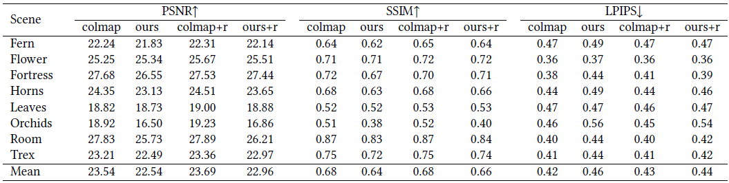 표준 LLFF 벤치마크에서 우리 모델은 COLMAP 사전 계산된 카메라 매개변수로 훈련된 기준선과 동등한 새로운 뷰 합성 결과를 달성합니다.