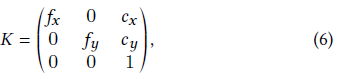 로 표현될 수 있습니다: 여기서 𝑓_𝑥 및 𝑓_𝑦는 각각 센서의 너비와 높이에 따른 카메라 초점 거리를 나타내고 𝑐_𝑥 및 𝑐_𝑦은 이미지 평면의 기본 점을 나타냅니다.
