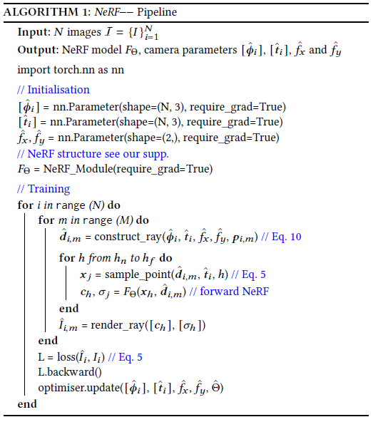 원래 NeRF의 학습 설정과 달리 여기에서는 알려진 카메라 매개변수 없이 RGB 이미지 I 세트만 입력으로 가정합니다.