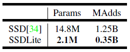 SSDLite는 일반 SSD와 비교하여 표 5와 같이 매개 변수 수와 계산 비용을 모두 크게 줄입니다.