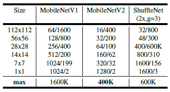 표 3에서는 MobileNetV1, MobileNetV2 및 ShuffleNet 간의 각 해상도에 필요한 크기를 비교합니다.