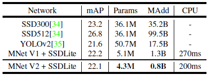 특히, SSDLite 감지 모듈과 결합된 우리의 아키텍처는 YOLOv2보다 계산량이 20배 적고 매개변수가 10배 적습니다.