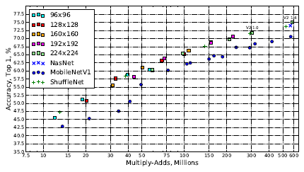 MobileNetV1, ShuffleNet 및 NASNet-A 모델과 네트워크를 비교합니다.