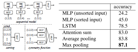 이들은 순서 없는 입력 세트를 소비하고 네트워크가 숫자를 정렬할 수 있다는 것을 보여주기 위해 주의 메커니즘이 있는 읽기-프로세스-쓰기 네트워크를 사용한다.