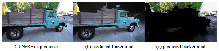 NeRF++는 전경과 배경이 모두 광선학을 위해 충실하게 표현되어야 하는 무한 장면의 매개 변수화를 개선한다.