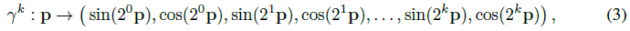 네트워크의 스펙트럼 편향을 보상하고 더 선명한 이미지를 합성하기 위해 NeRF는 x와 d를 푸리에 특징에 매핑하는 위치 인코딩 γ를 사용한다(Tancik 등, 2020):