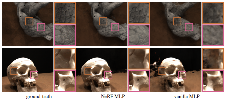 우리는 NeRF에 사용되는 특정 MLP 구조가 그러한 모호성을 피하는 데 중요한 역할을 하여 새로운 관점을 합성할 수 있는 인상적인 능력을 제공한다는 것을 경험적으로 보여준다.