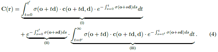광선 r = o + td에 대한 항 (iii)을 계산하기 위해서는 먼저 σ_out, c_out을 임의의 1/r에서 평가할 수 있어야 한다.