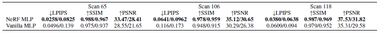 c에 대한 이 대체 모델을 사용하여 처음부터 NeRF를 학습하면 그림 4와 표 1에 표시된 바와 같이 NeRF의 특수 MLP에 비해 테스트 이미지 품질이 저하됩니다.