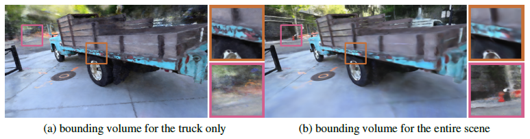 360˚ 캡처의 경우 NeRF는 전체 장면이 경계 볼륨으로 채워질 수 있다고 가정하며, 이는 대규모 장면에서 문제가 된다: 장면의 작은 부분을 볼륨에 맞추고 상세하게 샘플링하지만 배경 요소를 완전히 캡처하는 데 실패한다; 또는 샘플링 해상도가 제한되어 있기 때문에 전체 장면을 볼륨에 맞추고 모든 부분에서 세부 정보가 부족합니다.