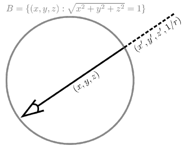 특히, 외부 볼륨에서 3D 포인트 (x, y, z), r = (x^2 + y^2 + z^2)^(1/2) > 1은 4중 (x', y', z', 1/r), x'^2 + y'^2 + z'^2 = 1로 재측정될 수 있습니다, 여기서 (x', y', z')는 (x, y, z)와 같은 방향의 단위 벡터이고, 0 < 1/r < 1은 구 바깥의 점 r · (x', y', z')를 지정하는 이 방향의 역반경이다.