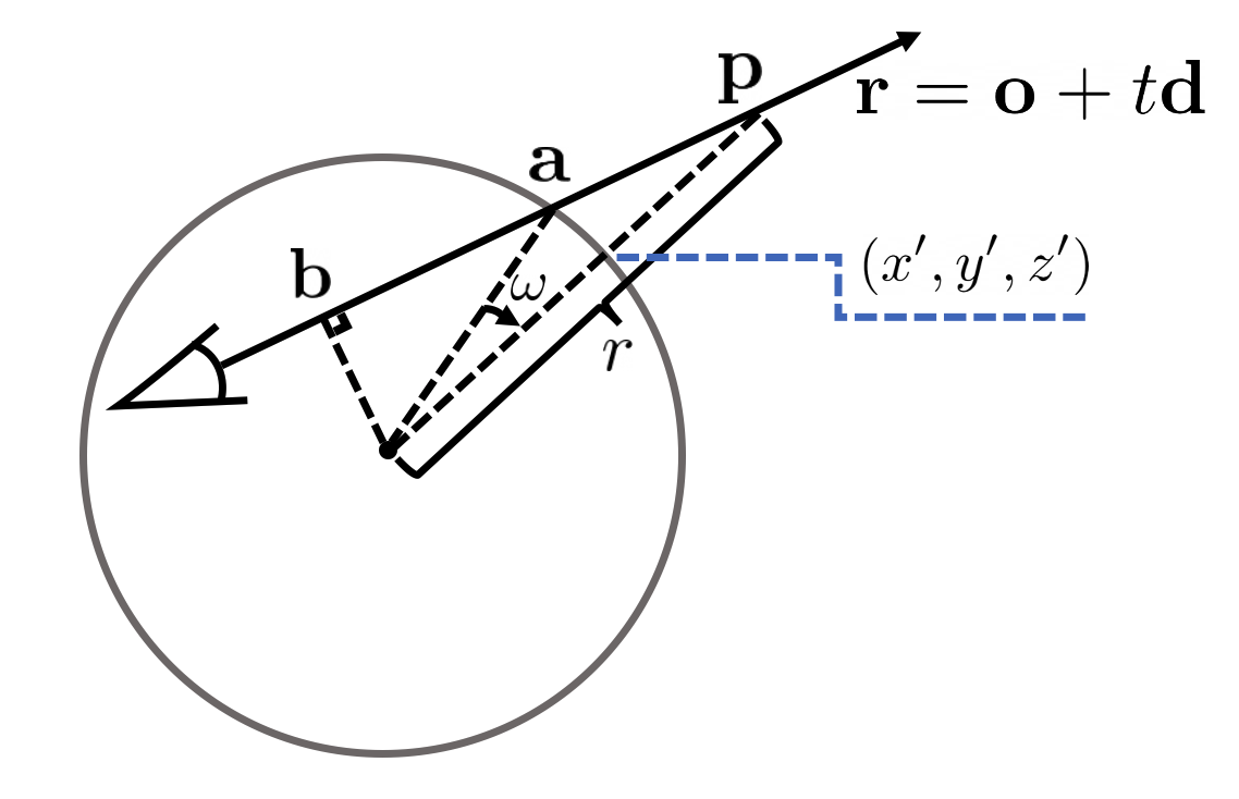 특히, 선 r = o + td가 단위구에 의해 두 개의 세그먼트로 분할된다고 가정하자: 첫 번째에서는 t ∈ (0, t')가 구 안에 있고, 두 번째에서는 t ∈ (t', ∞)가 구 외부에 있다.