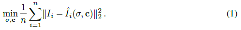 n개의 훈련 영상이 주어졌을 때 NeRF는 확률적 경사 강하를 사용하여 ground-truth 관측 이미지 I_i와 동일한 시야에서 렌더링된 예측 이미지 ^I_i(σ, c) 사이의 불일치를 최소화함으로써 최적화 σ 및 c를 사용한다.