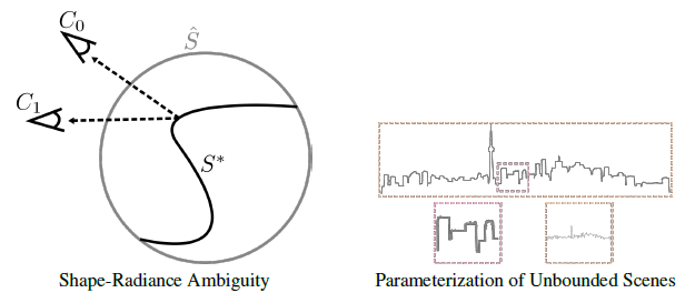 요약하면, 우리는 NeRF가 shape-radiance 모호성을 해결하기 위해 관리하는 방법에 대한 분석과 360˚ 캡처의 경우 무한 장면의 매개 변수화에 대한 해결책을 제시한다.